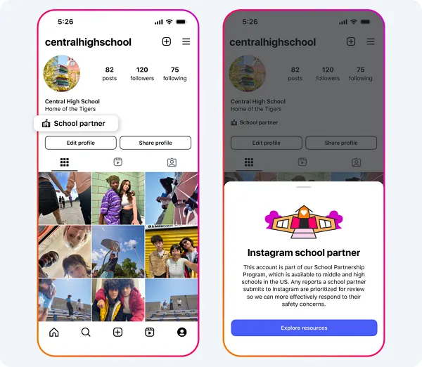 Школи-учасники також зможуть розмістити банер у своєму профілі Instagram, щоб показати батькам і учням, що вони є офіційним партнером Instagram у цьому напрямі. Для студентів це означає більше можливостей виділити себе — тепер у профілі можна додати не лише навчальний заклад, а й список занять. Такий функціонал допомагає створювати спільноту за інтересами й спрощує взаємодію всередині кампусів. Докладніше — у статті Instagram додає списки занять у коледжах до профілів студентів.
