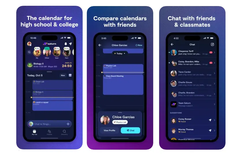 Як видно з цих прикладів екранів, Saturn в першу чергу орієнтований на те, щоб учням було простіше дотримуватись своїх шкільних зобов’язань, але це також стосується можливості ділитися своїм календарем з друзями, а також спілкуватися в чаті та приєднуватися до заходів у додатку.