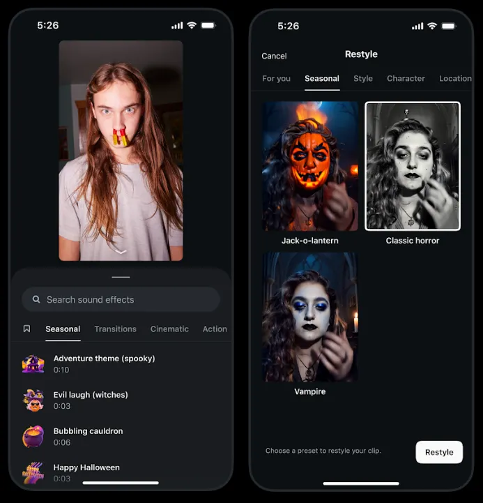Итак, если вы хотите создать короткометражный страшный видеоролик на Хэллоуин, чтобы проникнуться духом этого праздника, теперь в вашем распоряжении целый ряд опций в приложении для редактирования видео Meta, обыгрывающих все традиционные клише этого сезона.