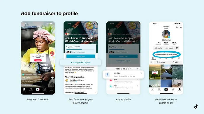 « Теперь, когда создатели контента запускают сбор средств на TikTok, любой, кто видит наклейку с просьбой о пожертвовании или видит сбор средств в своей биографии TikTok, может легко добавить наклейку прямо в свой контент TikTok, разместив ссылку на пожертвование в своей биографии и используя наклейку с просьбой о пожертвовании в посте или истории».