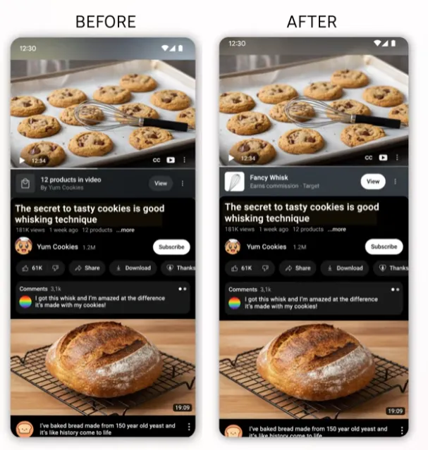 YouTube также стремится сделать временные метки, связанные с продуктами, менее отвлекающими в портретном режиме мобильного устройства, добавив панель продуктов под окном воспроизведения вместо всплывающего уведомления на экране. Это изменение перекликается с более глобальными визуальными обновлениями интерфейса, о которых подробно рассказано здесь YouTube представляет обновления пользовательского интерфейса, древовидные комментарии, аудиоответы и многое другое.