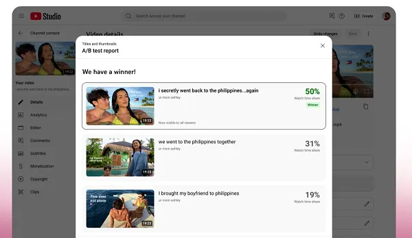 YouTube также расширяет возможности A/B-тестирования миниатюр и названий: теперь создатели могут тестировать до трех вариантов для каждого клипа.